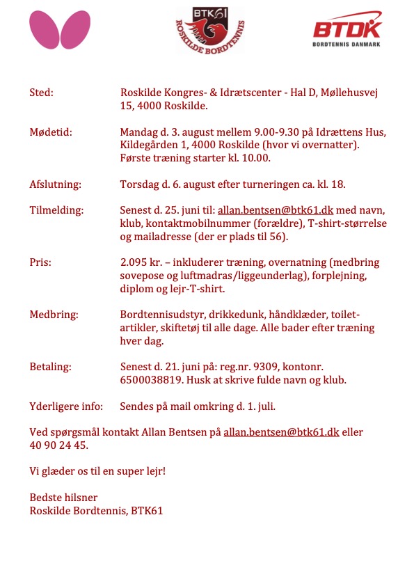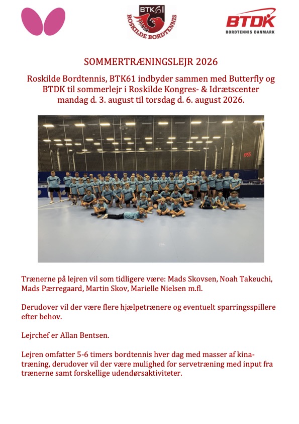 Så er indbydelsen til Roskilde Bordtennis sommerlejr klar.